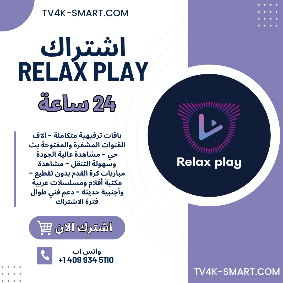 اشتراك ريلاكس بلاي Relax Play تجريبي لمدة 24 ساعة لمشاهدة المحتوى الترفيهي على اختلاف أنواعه بدون تقطيع، بفضل قوة وثبات السيرفر وكفاءة البيانات، سوف تتمكن من مشاهدة ماتش الفريق المفضل لك بأفضل جودة ممكنة تتناسب مع سرعة الإنترنت لديك وبدون تشويش أو تقطيع، أيضًا مكتبة شاملة من الأفلام والمسلسلات لكي تناسب كافة أفراد العائلة، سواء الأب أو الأم أو الأطفال،، ودعم فني طوال فترة اشتراكك، كل ذلك والمزيد والمزيد والمزيد مع سيرفر ريلاكس بلاي الذي يعتبر من ضمن أفضل اشتراكات IPTV التي يقدمها متجر تي في سمارت.